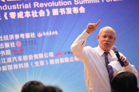 美國著名趨勢(shì)學(xué)家杰里米·里夫金16日在本報(bào)和中信出版社聯(lián)合主辦的“2014第三次工業(yè)革命高峰論壇”上表示,中國應(yīng)加快向“零邊際成本社會(huì)”推進(jìn),這會(huì)使中國一直到2050年持續(xù)保持繁榮。本次論壇獲安徽江淮汽車股份有限公司支持。
