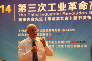 圖1:美國著名趨勢學家里夫金在“2014第三次工業(yè)革命高峰論壇”上演講。王皓然/攝 |