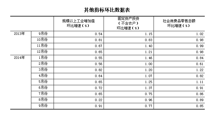 。2)根據(jù)季節(jié)調(diào)整模型自動修正結(jié)果,對近一年來各期國內(nèi)生產(chǎn)總值、規(guī)模以上工業(yè)增加值、固定資產(chǎn)投資(不含農(nóng)戶)、社會消費(fèi)品零售總額環(huán)比增速進(jìn)行修訂。修訂結(jié)果及2014年三季度GDP環(huán)比數(shù)據(jù)、2014年9月份其他指標(biāo)環(huán)比數(shù)據(jù)如下: