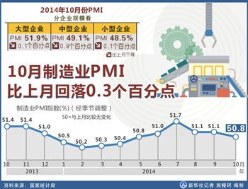 中國物流與采購聯(lián)合會、國家統(tǒng)計局服務(wù)業(yè)調(diào)查中心11月1日發(fā)布的數(shù)據(jù)顯示,2014年10月中國制造業(yè)采購經(jīng)理指數(shù)(PMI)為50.8%,較上月回落0.3個百分點,為5個月新低。多方分析認為,PMI未能如預(yù)期回升,預(yù)示著當(dāng)前市場內(nèi)生動力仍弱。受益于近期陸續(xù)出臺的調(diào)控政策,四季度經(jīng)濟增長可能基本保持平穩(wěn),但隨著政策效力消退,明年中國經(jīng)濟將面臨更嚴峻考驗。