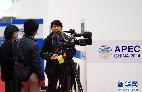 11月4日,國家會議中心新聞中心綜合服務(wù)臺的工作人員在提供咨詢服務(wù)。當日,2014年亞太經(jīng)合組織(APEC)領(lǐng)導人會議周兩個新聞中心之一的國家會議中心新聞中心正式啟用向媒體記者開放。據(jù)介紹,新聞中心總面積約11000平方米,全面覆蓋免費無線網(wǎng)絡(luò),將為媒體提供視頻、文字、圖片綜合素材和專業(yè)的廣播電視服務(wù)。新華社記者 陳曄華/攝