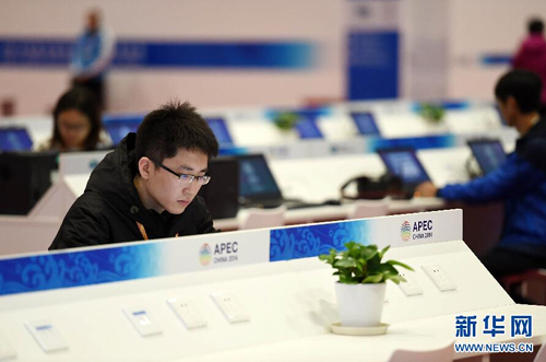 11月4日,國(guó)家會(huì)議中心新聞中心綜合服務(wù)臺(tái)的工作人員在提供咨詢服務(wù)。當(dāng)日,2014年亞太經(jīng)合組織(APEC)領(lǐng)導(dǎo)人會(huì)議周兩個(gè)新聞中心之一的國(guó)家會(huì)議中心新聞中心正式啟用向媒體記者開(kāi)放。據(jù)介紹,新聞中心總面積約11000平方米,全面覆蓋免費(fèi)無(wú)線網(wǎng)絡(luò),將為媒體提供視頻、文字、圖片綜合素材和專業(yè)的廣播電視服務(wù)。新華社記者