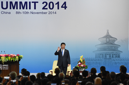 11月9日,2014年亞太經(jīng)合組織工商領(lǐng)導(dǎo)人峰會(huì)在北京國(guó)家會(huì)議中心舉行,國(guó)家主席習(xí)近平出席開幕式并發(fā)表題為《謀求持久發(fā)展 共筑亞太夢(mèng)想》的主旨演講。圖為習(xí)近平向與會(huì)嘉賓揮手致意。