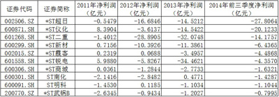 WIND統(tǒng)計數(shù)據(jù)顯示,截至目前滬深兩市風(fēng)險警示類股票共計有50只。從最近一個季度的財務(wù)指標(biāo)來看,其中每股凈資產(chǎn)為負(fù)的有7家,分別為*ST武鍋B、*ST超日、*ST昌九、*ST商城、ST南化、*ST霞客和*ST傳媒,每股凈資產(chǎn)分別為-4.86元、-3.70元、-0.61元、-0.54元、-0.52元、-0.23元和-0.01元。包括*ST鳳凰等在內(nèi)的13只風(fēng)險警示類股票的每股凈資產(chǎn)也在1元以下。從盈利情況來看,上述50只股票中,2014年前三季度共計有27家出現(xiàn)虧損,有18家企業(yè)2012年、2013年連續(xù)虧損并在今年前三個季度繼續(xù)虧損,可謂“命懸一線”,其中,*ST武鍋B、*ST二重、*ST超日2011年、2012年、2013年和2014年前三季度均呈現(xiàn)虧損狀態(tài),更是一只腳已經(jīng)踏入了退市程序。
