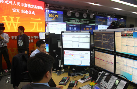 韓中銀行間韓元對人民幣直接交易12月1日上午9時在韓正式啟動,這是韓國離岸人民幣市場發(fā)展中具有標志性意義的事件,有助于降低貨幣兌換和交易成本。 圖為當日在韓國首爾,交易員在韓國外換銀行進行人民幣與韓元直接交易操作。