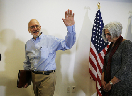 12月17日,在美國首都華盛頓,被古巴釋放的已被監(jiān)禁5年的美國承包商艾倫·格羅斯和妻子出席新聞發(fā)布會后離開。