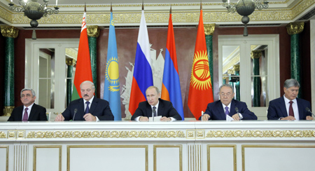 12月23日,俄羅斯總統(tǒng)普京在當日召開的歐亞經濟聯盟最高理事會會議上表示,歐亞經濟聯盟對所有鄰國開放,這些國家不僅包括獨聯體國家,還包括俄羅斯在東西方的合作伙伴。 歐亞經濟聯盟由俄羅斯、白俄羅斯、哈薩克斯坦三國關稅同盟發(fā)展而來。根據條約,聯盟將于明年1月1日正式啟動,并在2025年前實現商品、服務、資本和勞動力自由流動。 圖為歐亞經濟委員會最高理事會會議后的新聞發(fā)布會。