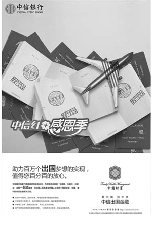 也許您喜歡徜徉在塞納河畔看著夕陽余暉,品味法國的浪漫;也許您期待坐著小艇穿梭在水城威尼斯,感受意大利文藝復興的展現(xiàn)的精致;又或許作為鐵桿球迷的您最希望坐在伯納烏球場,親自為心愛的球隊搖旗吶喊。隨著經(jīng)濟發(fā)展和人們文化素質(zhì)的提高,國內(nèi)游已經(jīng)不能滿足我國居民的旅行需求。現(xiàn)在,越來越多的人期待走出國門“看一看”、“充充電”,但復雜的出國手續(xù)和陌生的國外生活讓許多人望而卻步!耙鰢,找中信”,越來越多的客戶通過中信銀行的出國金融服務,輕松完成了出國夢。據(jù)介紹,中信銀行出國金融服務具備以下四大專業(yè)優(yōu)勢:可實現(xiàn)全球ATM取現(xiàn),取款零時差;信用卡主(附)卡的境外消費即時動態(tài)反饋;學費電匯業(yè)務可智能交易記錄,再次回款無需填表;房產(chǎn)抵押綜合授信申請留學貸款,一次抵押多次支用,資金運用更靈活。就是憑借這些專業(yè)而優(yōu)質(zhì)的服務,中信銀行讓客戶“走出國門”的愿望變得更加簡單易行。據(jù)了解,中信銀行在今年四季度的“中信紅·感恩季,愛在感恩有禮”零售業(yè)務綜合營銷活動中,將出國金融作為特色產(chǎn)品,配備了系列優(yōu)惠活動,感恩回饋客戶,提升客戶滿意度。