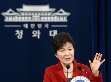 1月12日,在韓國(guó)首爾,韓國(guó)總統(tǒng)樸槿惠在青瓦臺(tái)新年記者會(huì)上發(fā)言。 樸槿惠表示,今后將加大對(duì)公共、勞動(dòng)、金融和教育4個(gè)領(lǐng)域結(jié)構(gòu)調(diào)整的力度,建設(shè)基礎(chǔ)鞏固的經(jīng)濟(jì)。另外,韓國(guó)政府已決定在4月前就解決公務(wù)員養(yǎng)老金虧損問(wèn)題達(dá)成相關(guān)協(xié)議。