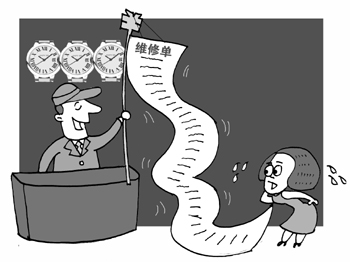 家住北京市朝陽(yáng)區(qū)的王小姐2012年底在美國(guó)亞馬遜網(wǎng)上下單,購(gòu)買了一塊卡地亞“藍(lán)氣球”鋼表,在使用了近兩年時(shí)間后,表帶上的穿釘開始變形甚至脫落,于是她來(lái)到了位于北京國(guó)貿(mào)的卡地亞專賣店,希望能就此問(wèn)題進(jìn)行檢修。在王小姐看來(lái),更換表帶穿釘是一項(xiàng)正常而簡(jiǎn)單的產(chǎn)品維修,自己應(yīng)該用不了幾天就能將已經(jīng)換好新穿釘?shù)氖直砣』亍?BR> 然而讓王小姐沒(méi)想到的是,卡地亞方面幾天后向她發(fā)送了一張高達(dá)6474元人民幣的報(bào)價(jià)清單。該清單上顯示,經(jīng)卡地亞維修技師的評(píng)估,需要對(duì)腕表進(jìn)行全面保養(yǎng)服務(wù),包括拆卸腕表表殼、機(jī)芯快慢調(diào)整、受磁情況檢測(cè)并在必要時(shí)退磁、維修真乃或更換損壞的機(jī)芯組建并恢復(fù)機(jī)芯功能、更換所有的膠圈、以超聲波清潔表殼與金屬表鏈、重新組裝腕表、檢測(cè)機(jī)芯的動(dòng)力儲(chǔ)能運(yùn)作、防水性能測(cè)試等。此外,報(bào)價(jià)單中還列有更換全新表盤和表針的費(fèi)用。