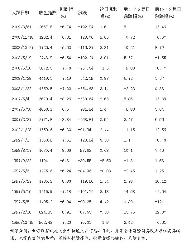 數(shù)據(jù)顯示,近年來(lái)上證指數(shù)當(dāng)天跌幅超過(guò)6%后,次日市場(chǎng)均出現(xiàn)不同程度的回升,其中2008年11月18日,滬指暴跌6.31%后,次日大漲6.05%。