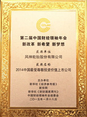 2015年1月18日“第二屆中國財經(jīng)領(lǐng)袖年會暨2014中國財經(jīng)年度人物頒獎盛典”在北京召開。大會從近千家公司中評出40家企業(yè)和28名年度領(lǐng)袖人物并進(jìn)行了表彰。風(fēng)神股份作為行業(yè)的領(lǐng)跑者,憑借優(yōu)異的經(jīng)營業(yè)績,被評為“2014中國最受尊敬投資價值上市公司”,并應(yīng)邀作為典型企業(yè)代表發(fā)言,輪胎行業(yè)僅風(fēng)神股份一家獲此殊榮。公司董事長王鋒被授予“2014中國最受尊敬上市公司領(lǐng)袖”榮譽稱號。