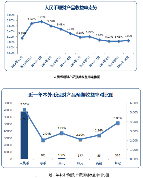 大數(shù)據(jù)君:嗯,銀行類理財產(chǎn)品收益率雖不比P2P,但風(fēng)險也小啊。請看大數(shù)據(jù):銀行類理財產(chǎn)品中,人民幣理財產(chǎn)品的平均預(yù)期收益率在監(jiān)測周期內(nèi)呈現(xiàn)出先揚后抑的走勢,在2014年1月達(dá)到最高的5.76%,隨后逐漸下滑,到2014年10月平均預(yù)期收益率僅為5.06%。外幣理財產(chǎn)品平均收益率小幅上升,主要貨幣中,美元的平均預(yù)期收益率較高,為2.79%。