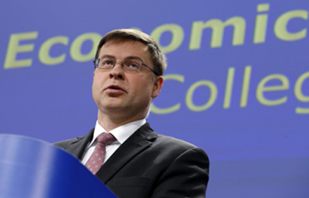 2月25日,在比利時(shí)首都布魯塞爾,歐盟委員會(huì)副主席、負(fù)責(zé)歐元與社會(huì)事務(wù)的委員東布羅夫斯基出席新聞發(fā)布會(huì)。 東布羅夫斯基當(dāng)日在新聞發(fā)布會(huì)上表示,歐委會(huì)決定同意歐元區(qū)第二大經(jīng)濟(jì)體法國(guó)推遲兩年至2017年實(shí)現(xiàn)歐盟規(guī)定的減赤目標(biāo)。