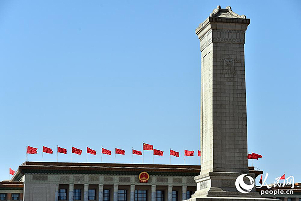 3月1日,2015年全國兩會即將召開。當日,北京風和日麗,藍天空氣質(zhì)量好,北京天安門廣場、人民大會堂,紅旗迎風招展,喜迎全國兩會開幕。