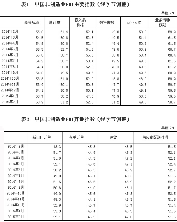 2015年2月,中國非制造業(yè)商務(wù)活動指數(shù)為53.9%,比上月上升0.2個百分點,高于榮枯線3.9個百分點,表明我國非制造業(yè)繼續(xù)保持平穩(wěn)擴張勢頭。