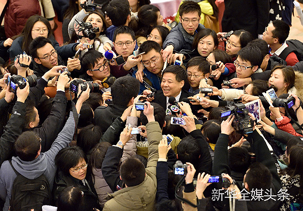 記者圍堵采訪全國(guó)政協(xié)委員、財(cái)政部副部長(zhǎng)朱光耀。“財(cái)神爺”就是受關(guān)注。新華社記者 李鑫 攝