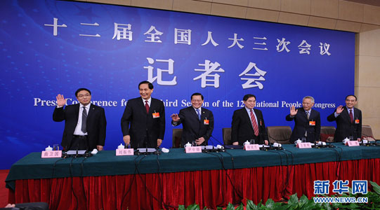 3月10日,十二屆全國人大三次會議新聞中心舉行記者會,邀請全國人大教科文衛(wèi)委員會主任委員柳斌杰、全國人大內(nèi)務(wù)司法委員會副主任委員王勝明、全國人大財政經(jīng)濟(jì)委員會副主任委員尹中卿、全國人大環(huán)境與資源保護(hù)委員會副主任委員袁駟、全國人大農(nóng)業(yè)與農(nóng)村委員會副主任委員劉振偉,對人大專門委員會與人大工作回答中外記者提問。圖為記者會現(xiàn)場。新華網(wǎng)/中國政府網(wǎng) 穆淼 攝