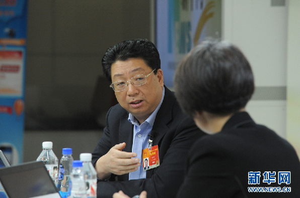 2015年3月11日,全國(guó)人大代表、浙江物產(chǎn)集團(tuán)董事長(zhǎng)王挺革做客新華會(huì)客廳。圖為王挺革與主持人交談。新華網(wǎng) 李江