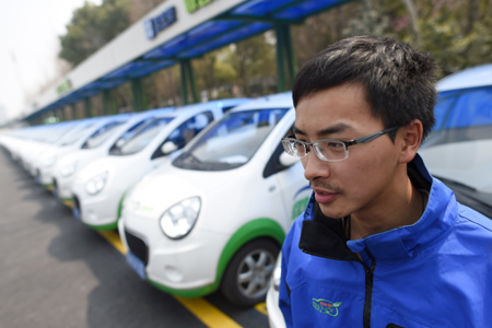 從3月16日起,杭州地鐵1號(hào)線江陵路站大型停車場(chǎng)內(nèi)的“微公交”純電動(dòng)汽車站點(diǎn)正式投入運(yùn)營。這是目前杭州規(guī)模最大的“微公交”平面租賃站,可提供60輛微型純電動(dòng)汽車。杭州從2013年9月起試運(yùn)營“微公交”,目前已有“微公交”純電動(dòng)汽車9851輛。圖為運(yùn)營方一名工作人員站在“微公交”江陵路站內(nèi)。