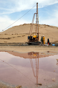 圖為在一處被污染的騰格里沙漠腹地,當(dāng)?shù)丨h(huán)保人員利用機(jī)井抽取不同層面的底泥與地下水樣本,為進(jìn)一步評(píng)估、鑒定提供科學(xué)依據(jù)。