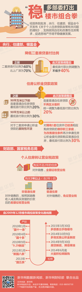 備受關(guān)注的“央版”房地產(chǎn)松綁政策正式落地。30日,央行、住建部、財(cái)政部、國(guó)稅總局等部門(mén)分別下發(fā)房地產(chǎn)新政以穩(wěn)定樓市增長(zhǎng),包括二套首付降為40%,首套房公積金貸款首付降為20%,二套房公積金貸款首付降為30%;此外,個(gè)人出售2年以上住房免征營(yíng)業(yè)稅。至此,加上上周剛剛落地的國(guó)土部與住建部發(fā)布的新政,中央方面對(duì)樓市已連下三劑猛藥。