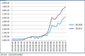從新三板剛剛發(fā)布的兩個(gè)指數(shù)來看,市場(chǎng)熱度驚人。數(shù)據(jù)顯示,截至3月31日收盤,全國(guó)中小企業(yè)股份轉(zhuǎn)讓系統(tǒng)成份指數(shù)(指數(shù)簡(jiǎn)稱:三板成指,指數(shù)代碼:899001)收?qǐng)?bào)1713.32點(diǎn)。全國(guó)中小企業(yè)股份轉(zhuǎn)讓系統(tǒng)做市成份指數(shù)(指數(shù)簡(jiǎn)稱:三板做市,指數(shù)代碼:899002)收?qǐng)?bào)1997.64點(diǎn)。2015年以來,三板成指已經(jīng)累計(jì)上漲了71.33%,三板做市已經(jīng)累計(jì)上漲了100.09%,同期,上證綜指和深證成指的漲幅則分別為15.87%和19.48%。