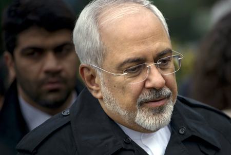 圖為4月1日在瑞士洛桑,伊朗外長扎里夫(前)在會議間隙散步。
