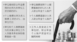 國務(wù)院辦公廳6日印發(fā)《機(jī)關(guān)事業(yè)單位職業(yè)年金辦法》,《辦法》規(guī)定,從2014年10月1日起實(shí)施機(jī)關(guān)事業(yè)單位工作人員職業(yè)年金制度,職業(yè)年金基金采用個(gè)人賬戶方式管理,實(shí)行單位和個(gè)人共同繳費(fèi),其中個(gè)人繳費(fèi)實(shí)賬積累,單位繳費(fèi)部分依單位性質(zhì)而定。