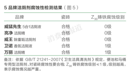 21241-2007《衛(wèi)生潔具清洗劑》測(cè)試5款潔廁劑對(duì)瓷磚和鑄鐵的腐蝕性,檢測(cè)結(jié)果顯示:5款潔廁劑對(duì)瓷磚的腐蝕性均判定為合格,但是對(duì)金屬的腐蝕性存在差異。衛(wèi)諾和萬麗兩品牌潔廁劑對(duì)金屬的腐蝕性較其他3品牌更大。