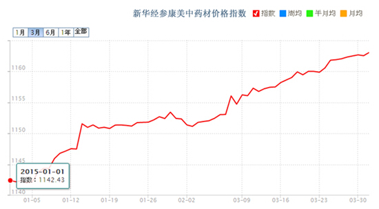 2015年第一季度,雖然由于春節(jié)緣故各大中藥材市場(chǎng)都進(jìn)行了短暫的閉市休整,但是“新華經(jīng)參康美中藥材價(jià)格指數(shù)”仍以上漲為主旋律,隱隱擺脫了2014年下半的小幅震蕩走勢(shì),尤其是2015年3月份指數(shù)雖然每天上漲幅度不大,但是在連續(xù)的上漲,截止2015年4月1日,指數(shù)收于1163.06點(diǎn),與2015年1月1日相比上漲20.63點(diǎn),同比上漲1.81%。從各大藥材市場(chǎng)反映來(lái)看目前市場(chǎng)交易氣氛不是很強(qiáng)烈,主要由于部分品種價(jià)格回升和供給影響對(duì)價(jià)格指數(shù)上漲有一定的支撐和推動(dòng)作用,預(yù)計(jì)后續(xù)在沒(méi)有大的行情推動(dòng)下仍然以小幅波動(dòng)為主。
