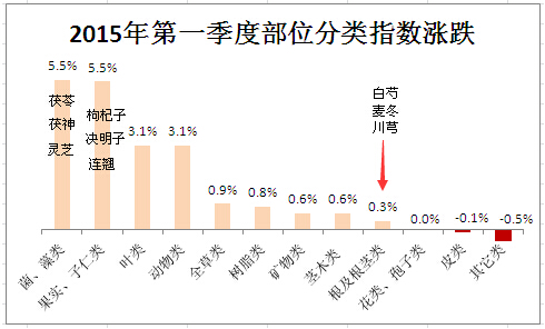 第一季度指數(shù)總體呈現(xiàn)上升趨勢(shì),其中12大部位分類(lèi)指數(shù)中,上漲部位9個(gè)走跌部位3個(gè),并且上漲幅度明顯高于走跌幅度。本季度漲幅最高的是菌藻類(lèi)和果實(shí)子仁類(lèi)上漲5.5%,其中菌藻類(lèi)主要由于茯苓、茯神和靈芝上漲所致,果實(shí)子仁類(lèi)類(lèi)主要由于枸杞子、決明子和連翹拉動(dòng)效果,另外部位分類(lèi)中第一大類(lèi)根及根莖類(lèi)微漲0.3%,其中上漲較明顯的有白芍、麥冬和川芎。其它部位分類(lèi)指數(shù)漲跌情況如圖3所示。