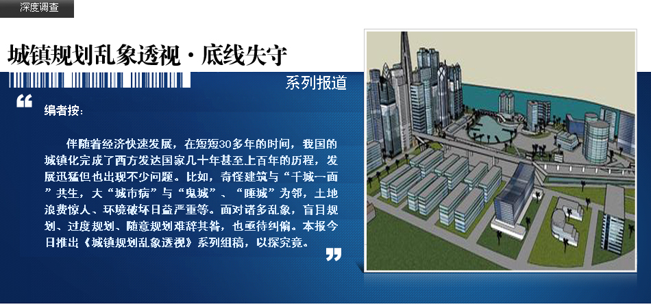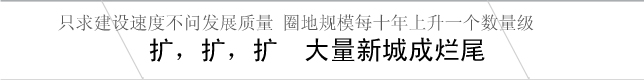 盲目規(guī)劃致新城失控 新城強(qiáng)調(diào)增量規(guī)劃,通過(guò)粗線條的膨脹來(lái)贏得發(fā)展,這在創(chuàng)造機(jī)遇的同時(shí)也帶來(lái)驚人的浪費(fèi)。專家和規(guī)劃人員認(rèn)為,各地新城出現(xiàn)盲目規(guī)劃、無(wú)序擴(kuò)張等問(wèn)題,根子在部分地方干部發(fā)展心態(tài)走偏。 |