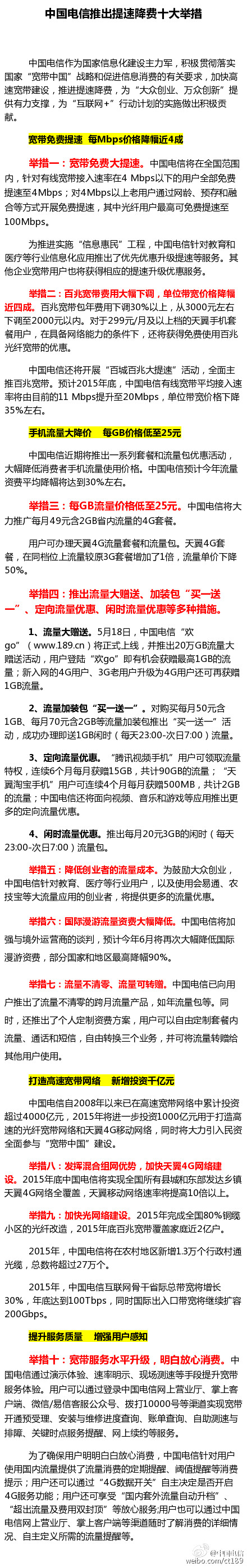 15日從中國電信微博獲悉,中國電信公布提速降費十大舉措。包括百兆寬帶費用大幅下調(diào),單位帶寬價格降幅近四成等措施。