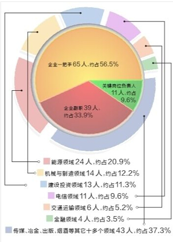 蔣潔敏、王帥廷、宋林、孫兆學、徐建一、廖永遠、王天普,十八大以來,僅“老虎級”國企高管便有7人“落馬”,映射出國企腐敗的嚴重性。中紀委網站去年至今公布的115名“落馬”國企高管從類型上看,其涉案人數分布為能源領域24人,占20.9%;機械與制造領域14人,約占12.2%;建設投資領域13人,約占11.3%;電信領域11人,約占9.6%;交通運輸領域6人,約占5.2%;金融領域4人,約占3.5%;傳媒、冶金、出版、煙酒等其它十多個領域43人,約占37.3%。