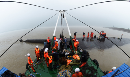 6月2日,救援人員在沉船現(xiàn)場對“東方之星”輪展開營救。 6月1日晚,從南京駛往重慶的客船“東方之星”輪在長江中游湖北監(jiān)利水域發(fā)生翻沉。據初步統(tǒng)計,事發(fā)客船共有458人,其中旅客406人。