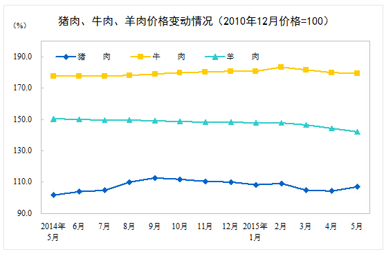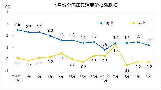 ???? 2015年5月份,全國(guó)居民消費(fèi)價(jià)格總水平同比上漲1.2%。其中,城市上漲1.3%,農(nóng)村上漲1.0%;食品價(jià)格上漲1.6%,非食品價(jià)格上漲1.0%;消費(fèi)品價(jià)格上漲0.9%,服務(wù)價(jià)格上漲2.1%。1-5月平均,全國(guó)居民消費(fèi)價(jià)格總水平比去年同期上漲1.3%。