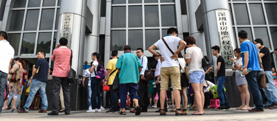 6月初,市民在深圳市房地產(chǎn)權(quán)登記中心外排隊(duì)等候取號(hào)。 記者