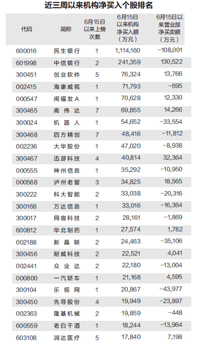 龍虎榜交易數(shù)據(jù)中,機構(gòu)席位買賣信息為投資者了解機構(gòu)動向提供參考。6月15日以來的A股巨震,讓不少個股遭遇資金斬倉出逃,但也有部分個股在市場“打折促銷”之時獲得機構(gòu)抄底買入。