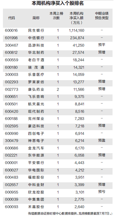 跟隨“國家隊”腳步,本周以來機構(gòu)席位護(hù)盤力度不斷加強。若從機構(gòu)凈買入額看,以銀行股為代表的藍(lán)籌股獲得機構(gòu)大手筆買入。比如民生銀行,不論從近三周還是本周來看,都是機構(gòu)凈買入額最大的個股。本周二,民生銀行現(xiàn)身龍虎榜,買入榜單中前四席位均被機構(gòu)占據(jù),賣出方中,僅有一家機構(gòu)席位現(xiàn)身,機構(gòu)席位合計凈買入111億元。近三周來,機構(gòu)凈買入金額排名第二位是中信銀行,本周和上周各上榜一次,機構(gòu)席位合計凈買入24億元。(陳文彬)