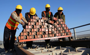 7月22日,中鐵九局鐵路建設(shè)者在額哈鐵路建設(shè)工地搬運(yùn)托軌滑輪。額哈鐵路是國家“一帶一路”戰(zhàn)略和《中長期鐵路規(guī)劃網(wǎng)》重點(diǎn)工程,預(yù)計(jì)年底建成投入運(yùn)營?!⌒氯A社發(fā)(蔡增樂攝) |