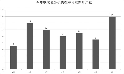 《經濟參考報》記者根據中債登數據統計,在今年新增的79家新增賬戶中,16家為7月一個月“貢獻”,剩余63家在1至6月依次分布為7家、14家、12家、10家、11家和9家。從投資規(guī)模上看,今年托管在中債登的境外機構債券投資額高達537億元,其中超半數為7月新增額,達284.5億元。