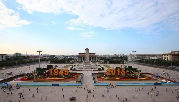 8月26日零時,天安門廣場紀念抗戰(zhàn)勝利70周年花卉全部布置完畢。此次天安門廣場花卉布置主要包括四個方面:人民英雄紀念碑周邊的檜柏花帶、人民英雄紀念碑北側(cè)的長城主題花壇、廣場內(nèi)東西兩塊綠地的花柱、花球、花帶以及廣場東西側(cè)路的花缽80組。其中長城主題花壇總占地3000平方米,兩組花壇每組東西長60米,南北寬25米,使用龍柏、葉子花、油松等大型植物3000株,小型花卉7萬盆、景觀石及仿真景觀石1200平方米。