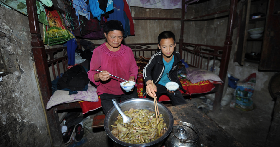 貴州省畢節(jié)市七星關(guān)區(qū)田坎鄉(xiāng)田坎村的瑞瑞是一名留守兒童,12歲的他和70歲的奶奶住在一間土坯房中。記者日前在他家里看到,房間里不但堆滿了廢品,還到處都是雞的糞便,充斥著一股濃烈的腐臭氣味。但即便這樣的房子也還是別人的。瑞瑞家的房子因年久失修成為危房,去年村里一位好心人擔心他們的安全將房子借給他們住。瑞瑞的爸爸三年前外出打工,但卻有一年多沒和家里聯(lián)系,媽媽兩年前改嫁到四川。記者看到,祖孫二人的午飯是由瑞瑞做的,主食為苞谷飯、菜是素瓜豆。他告訴記者,上學期間6點多就要起床,第一件事就是做飯,晚飯也是自己做。