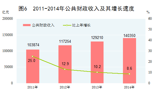 國(guó)家財(cái)政實(shí)力明顯增強(qiáng)。2011年,我國(guó)公共財(cái)政收入突破10萬(wàn)億元大關(guān),2014年超過(guò)14萬(wàn)億元,比2010年增長(zhǎng)68.9%,年均增長(zhǎng)14.0%。隨著國(guó)家財(cái)政實(shí)力增強(qiáng),財(cái)政對(duì)經(jīng)濟(jì)社會(huì)發(fā)展的支持不斷加大。2014年,我國(guó)公共財(cái)政支出超過(guò)15萬(wàn)億元,比2010年增長(zhǎng)68.7%。重點(diǎn)領(lǐng)域民生支出得到較好保障。2011-2014年,城鄉(xiāng)社區(qū)事務(wù)、醫(yī)療衛(wèi)生、交通運(yùn)輸、教育、社會(huì)保障和就業(yè)支出年均分別增長(zhǎng)21.1%、20.4%、17.2%、16.2%和14.9%。