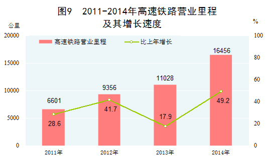 交通運(yùn)輸能力持續(xù)增強(qiáng)。高效、便捷的鐵路網(wǎng)、公路網(wǎng)、航空運(yùn)輸網(wǎng)、城際鐵路網(wǎng)、航道網(wǎng)逐漸形成。2014年末,鐵路營(yíng)業(yè)里程、公路里程、高速公路里程、定期航班航線里程分別達(dá)到11.2萬(wàn)公里、446.4萬(wàn)公里、11.2萬(wàn)公里、463.7萬(wàn)公里,分別比2010年末增長(zhǎng)22.6%、11.4%、51.0%、67.7%。特別是,高速鐵路迎來(lái)了史無(wú)前例的大發(fā)展,2014年高速鐵路運(yùn)營(yíng)里程突破1.6萬(wàn)公里,位居世界第一,我國(guó)高鐵還駛出國(guó)門,參與多國(guó)鐵路建設(shè),成為獨(dú)具特色、彰顯國(guó)力的中國(guó)名片。