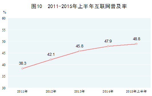 信息通信發(fā)展水平快速提高。2014年,我國(guó)郵電業(yè)務(wù)總量21846億元(按2010年不變價(jià)格計(jì)算),比2010年增長(zhǎng)90.4%,年均增長(zhǎng)17.5%。移動(dòng)互聯(lián)網(wǎng)產(chǎn)業(yè)方興未艾,“寬帶中國(guó)”戰(zhàn)略加快實(shí)施。2014年末,移動(dòng)電話用戶、互聯(lián)網(wǎng)上網(wǎng)人數(shù)分別達(dá)到12.9億戶、6.5億人,分別比2010年增長(zhǎng)49.7%、41.9%;移動(dòng)電話普及率、互聯(lián)網(wǎng)普及率分別達(dá)到94.5部/百人、47.9%,分別比2010年提高30.1部/百人、13.6個(gè)百分點(diǎn)。