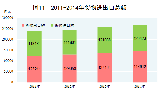 進(jìn)出口貿(mào)易規(guī)模穩(wěn)步擴(kuò)大。盡管國(guó)際金融危機(jī)以來(lái)世界經(jīng)濟(jì)復(fù)蘇步履蹣跚,但由于黨中央國(guó)務(wù)院積極應(yīng)對(duì),我國(guó)進(jìn)出口貿(mào)易總體上保持了穩(wěn)定增長(zhǎng),占國(guó)際貿(mào)易的份額繼續(xù)上升。2014年,我國(guó)貨物進(jìn)出口總額達(dá)到26.4萬(wàn)億元,居世界第一位,比2010年增長(zhǎng)31.0%,年均增長(zhǎng)7.0%。貨物進(jìn)出口總額占世界貿(mào)易總額的比重為11.3%,比2010年提高1.7個(gè)百分點(diǎn)。