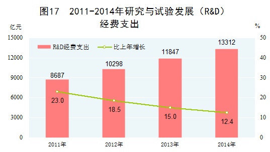 科技事業(yè)成果豐碩。2014年,研究與試驗(yàn)發(fā)展(R&D)經(jīng)費(fèi)支出13312億元,比2010年增長(zhǎng)88.5%,占國(guó)內(nèi)生產(chǎn)總值的比重為2.09%,比2010年提高0.36個(gè)百分點(diǎn)。專利申請(qǐng)量和授權(quán)量大幅增加。2014年,受理境內(nèi)外專利申請(qǐng)236萬(wàn)件,授予專利權(quán)130萬(wàn)件,分別比2010年增長(zhǎng)93.2%和59.9%?;A(chǔ)研究和前沿技術(shù)研究取得一批重大成果,探月工程、載人深潛、衛(wèi)星應(yīng)用、超級(jí)計(jì)算等重大科研項(xiàng)目取得新突破,為產(chǎn)業(yè)轉(zhuǎn)型升級(jí)提供了強(qiáng)有力的技術(shù)支撐。