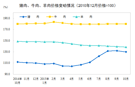10月份,食品價格同比上漲1.9%,影響居民消費價格總水平上漲約0.65個百分點。其中,肉禽及其制品價格上漲7.2%,影響居民消費價格總水平上漲約0.54個百分點(豬肉價格上漲15.8%,影響居民消費價格總水平上漲約0.48個百分點);鮮菜價格上漲4.7%,影響居民消費價格總水平上漲約0.14個百分點;水產(chǎn)品價格上漲2.1%,影響居民消費價格總水平上漲約0.05個百分點;糧食價格上漲1.2%,影響居民消費價格總水平上漲約0.04個百分點;蛋價下降13.8%,影響居民消費價格總水平下降約0.13個百分點;鮮果價格下降9.1%,影響居民消費價格總水平下降約0.21個百分點。